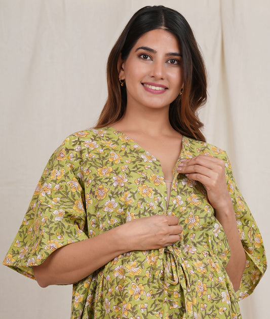 Green Flower Printed Cotton Nursing Feeding Kaftan