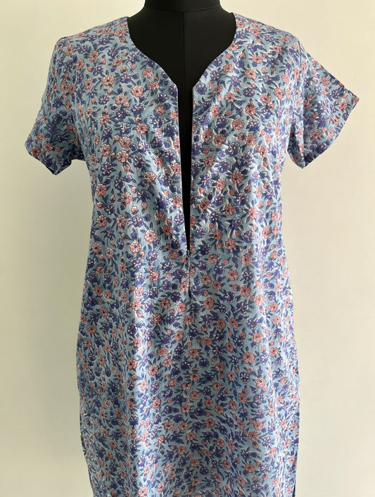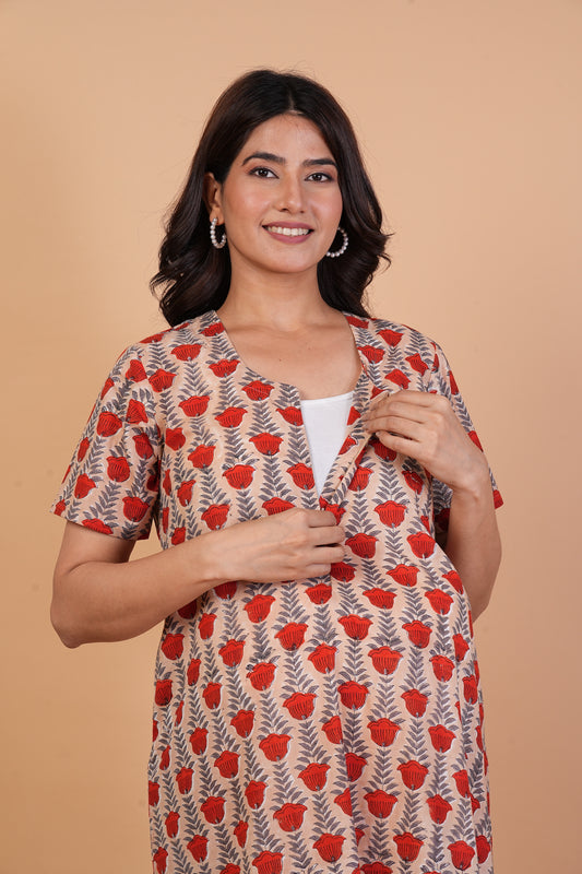 Dhaarna Handblock Cotton Nursing Nightie / Gown with Feeding Zip