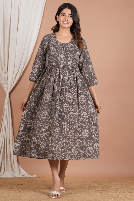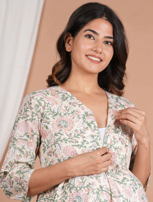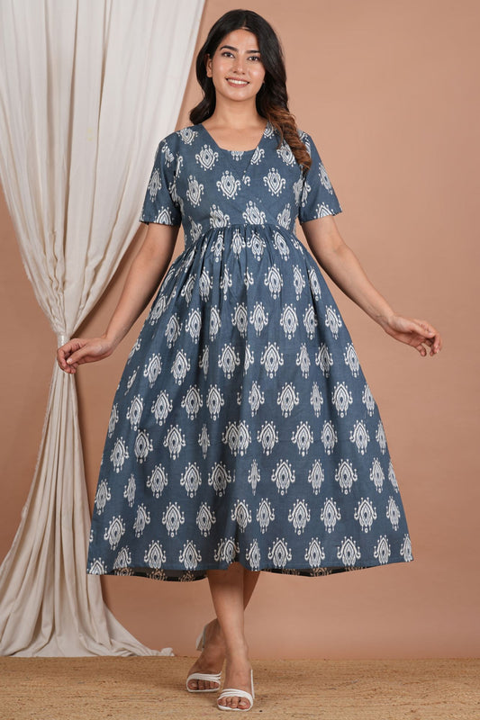 Nirguna Handblock Cotton Maternity Feeding Dress with Zip